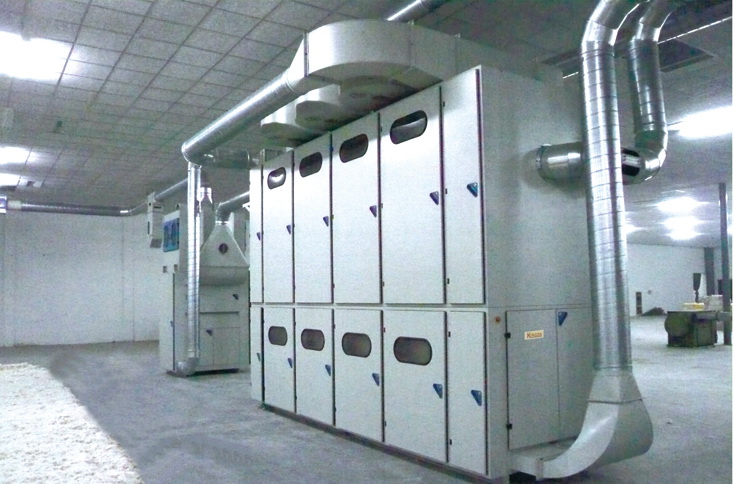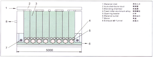 由風(fēng)械將棉花送入棉倉,由微壓開關(guān)控制棉位,不同棉倉以差速輸出達(dá)到高倍混棉功能,利用氣流及對流將原料往后道設(shè)備輸送。